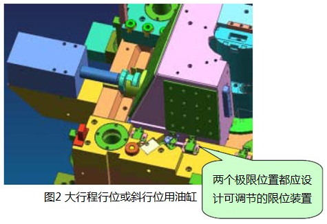在模具結構中油缸應有行程限位控制開關,確保活塞端隙;同時應具備模具生產(chǎn)時自動控制所必須的信號源。