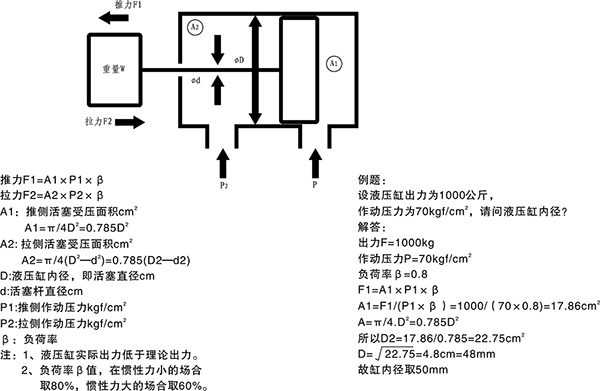 由力的計算公式可知: F = PS(P:壓強; S:受壓面積—由油缸的缸徑、桿徑決定)